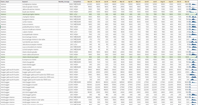 This project demonstrates an advanced approach to keyword research for the German “Baumaschinen” (construction machinery) market. Using a custom-built analytical tool, we processed high-volume search data to identify seasonal patterns and purchase intent for rental and sales categories. The table presented below is merely a demonstration sample covering primary marker queries. In a full-scale keyword research project, we process several thousand keywords, including highly specific niche terms and detailed long-tail phrases that drive maximum conversion rates.