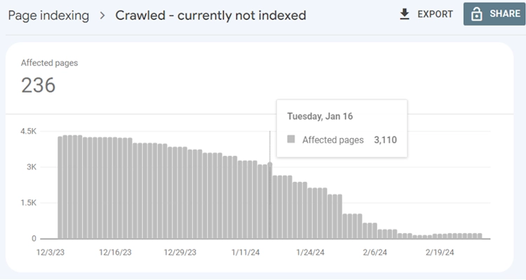 - Drastic Queue Reduction: Decreased “Crawled – currently not indexed” pages from 3,110 to about zero.